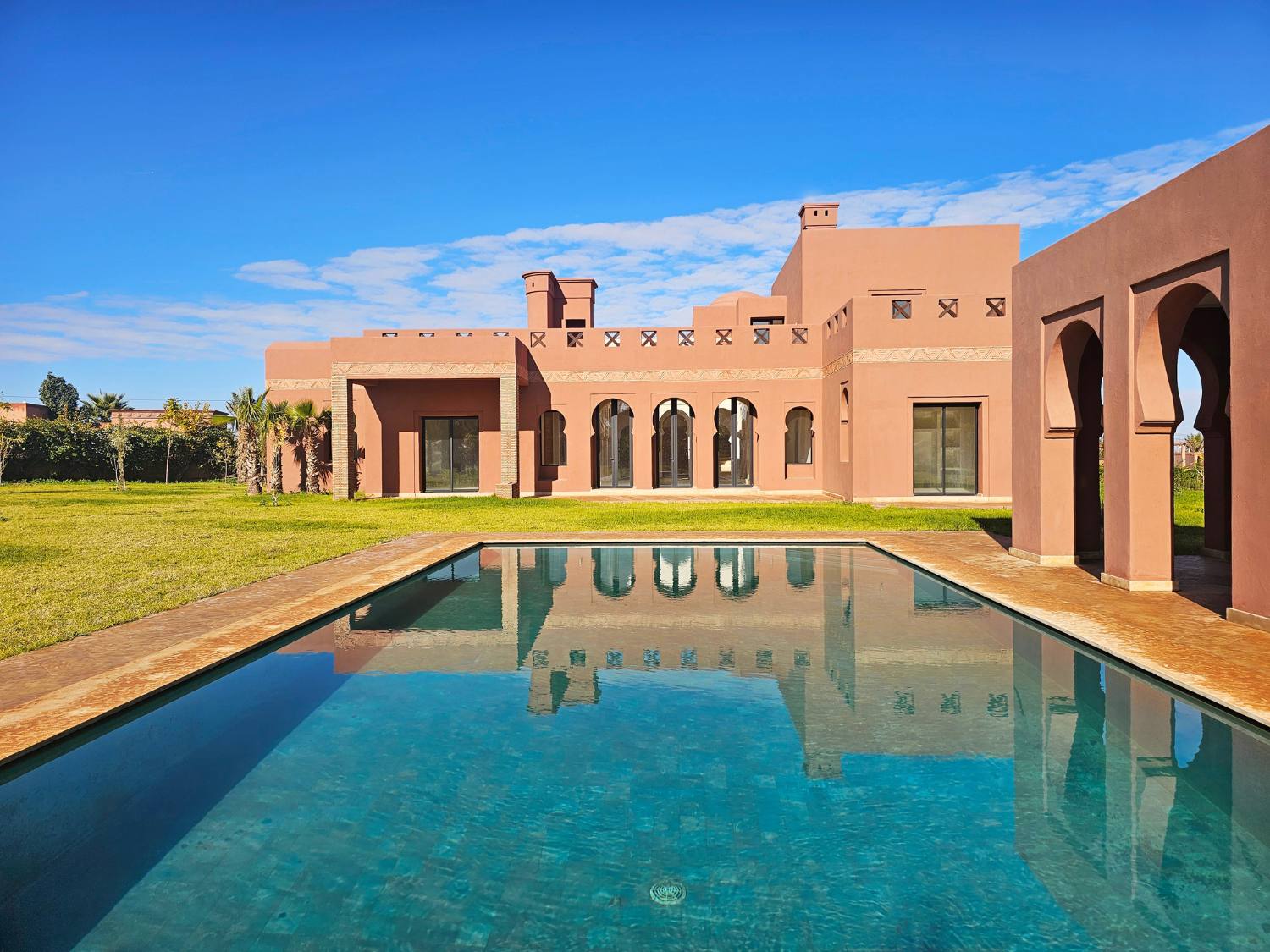 Chaque villa dispose de 4 suites réparties sur deux niveaux, comprenant des chambres, des salles de bain, des dressings et des terrasses. Le rez-de-chaussée offre un salon marocain traditionnel, une salle à manger et un salon avec cheminée, tous articulés autour d’un patio ouvert. La piscine extérieure est conçue pour offrir un espace de fraîcheur et de détente au milieu d’un jardin paysager.